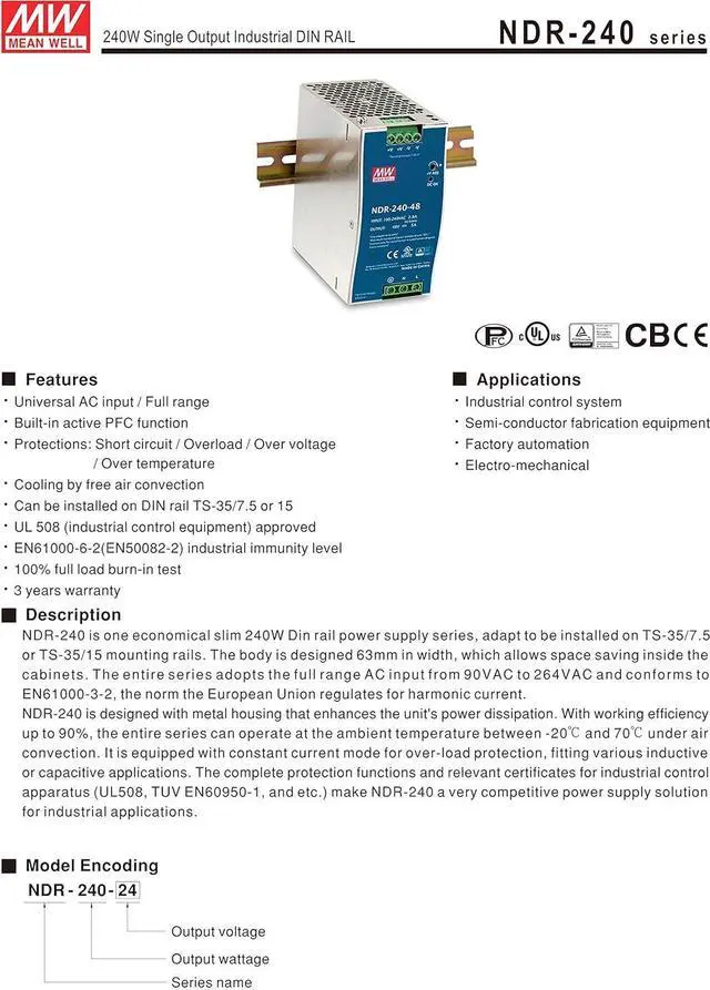 MEAN WELL MW NDR-240-24 24V 10A 240W Single Output Industrial DIN Rail Power Supply