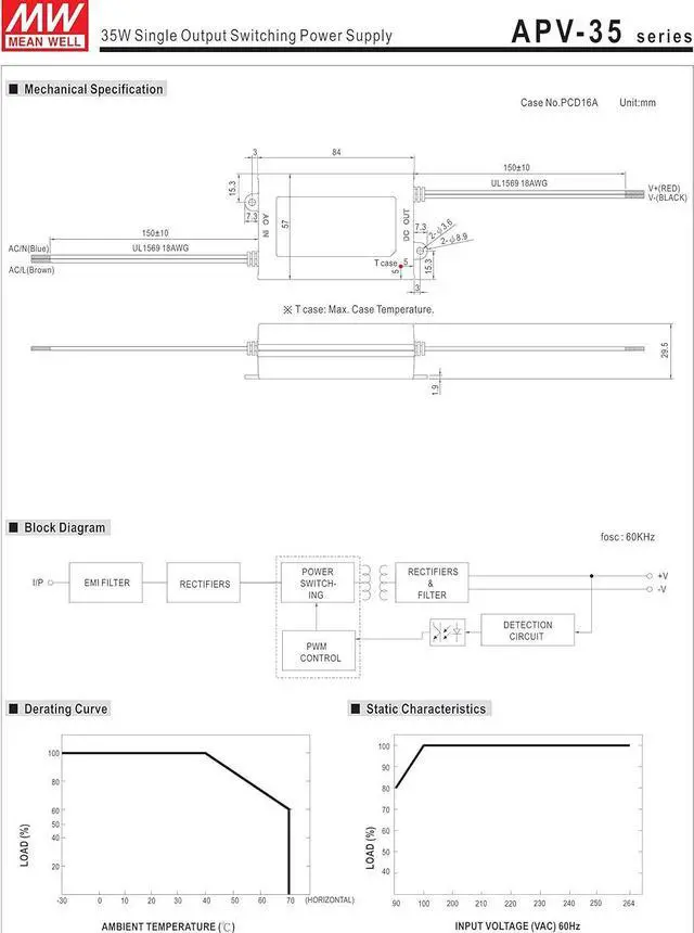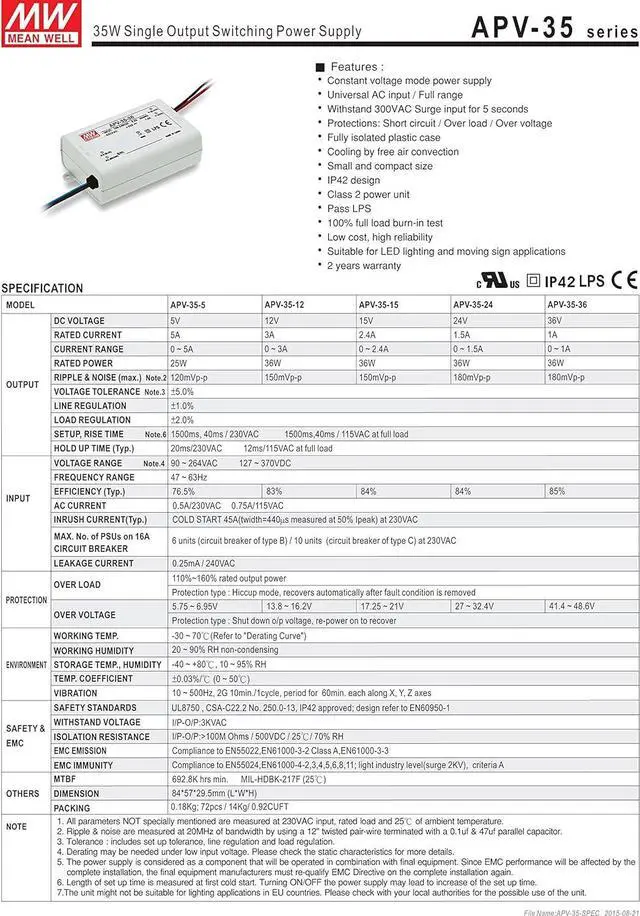 No load power consumption <0.5W for APV-8 IP30 design Withstand 300VAC surge input for 5 seconds (APV-25/35)