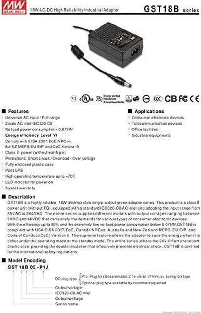 GST series of green energy-saving high-end enterprise level adapters can work continuously for a long time in 7x24 hours. Is widely used in IT, security, industrial control, LED lighting and other fields. Type B in line with European safety standards multi medium new.
