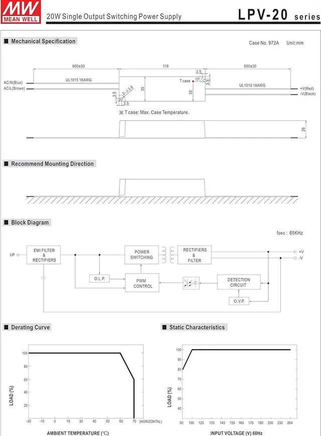 Protections: Short circuit / Overload / Over voltage / Over temperature (LPH-18/LPL-18 only)