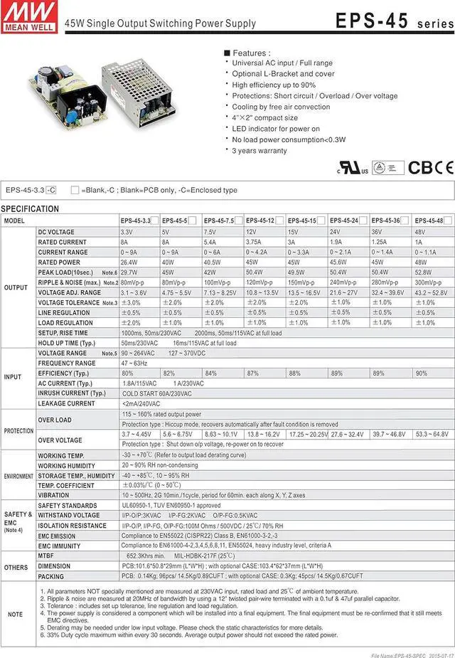 Mean Well Original EPS-45-3.3 Single Green Open Frame Output Switching Power Supply 3.3V 8A 26W