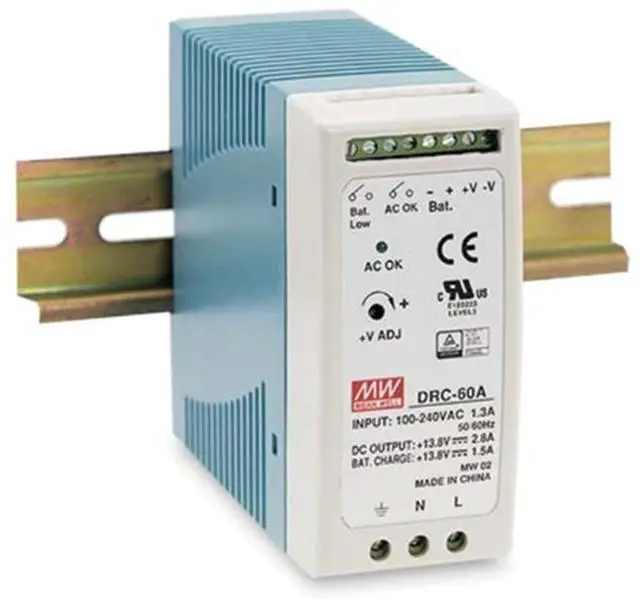 DIN Rail Switching Power Supply 27.6 Volts 1.4/0.75 Amps 60 Watts 27.6 Volts @ 1.4/0.75 Amps Find out more about MEAN WELL Security Power Solutions.Specifications --Output Power (W): 59.34 --Ripple & Noise (mV p-p): 200 --Load Regulation (+/-): 0.5% --Line Regulation (+/-): 0.5% -- Efficiency: 88% --Agency Approvals: UL, CUL, TUV --Size (L x W x H) inches: 3.93 X 1.57 X 3.54 --Universal AC input / Full range --Protections: short circuit, over voltage, overload --Battery low protection/Battery polarity protection by fuse --Can be installed on DIN rail TS-35/7.5 or 15 --Alarm signal for AC OK and Battery low --Cooling by free air convection --LED indicates power on --100% full load burn in tested --3 year warranty
