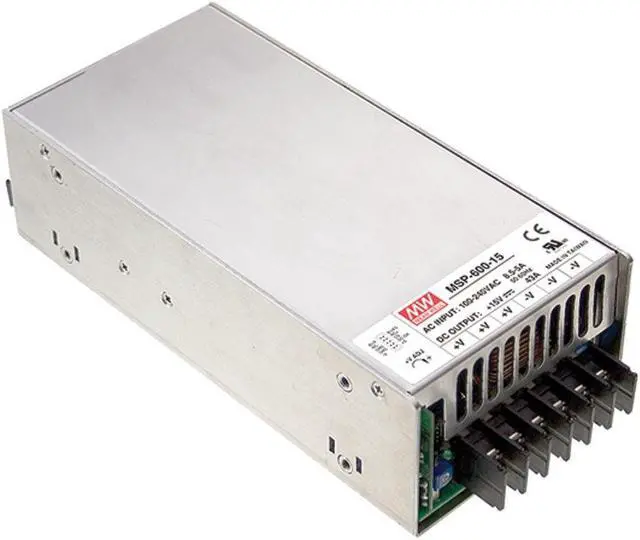 AC to DC Switching Medical Power Supply Single Output with PFC Function 24 Volts 27 Amps 648 Watts 24 Volts 27 Amps Specifications Output Power (W): 648 Size (L x W x H) inches: 8.6 X 4.12.5 Ripple & Noise (mV p-p): 150 Line Regulation (±): 0.2% Load Regulation (±): 0.5% Efficiency: 88% Agency Approvals: UL/CUL/CB/CE Universal AC input / Full range Built in active PFC function, PF > 0.95 Protections: short circuit, over voltage, over temperature, over current Withstand 300 VAC surge input for 5 seconds Built in constant current limiting circuit Medical safety approved (MOOP Level) Built in cooling fan with ON-OFF control Built in DC OK signal Built in remote ON-OFF control Stand by 5 volt 0.3 Amps Built in remote sense function No load power consumption 5 year warranty Detailed Specifications: Primary Output Voltage (VDC): 24 Output Current (A): 27 Maximum Output Power (W): 648 Family: MSP-600 Input Voltage (VAC): 85 to 264 Input Frequency: 47 to 63 Maximum Input Current (A): 8.5 Number of Outputs: 1 Product Type: AC to DC Power Supply MFR Product Family: MSP-600 Efficiency (%): 88 Operating Temperature-Min (Cell): -40 Operating Temperature-Max (Cell): 70 Length (inch): 8.6 Width (inch): 4.1 Height (inch): 2.5 Agency Approvals: UL/CUL/CB/CE Color: Silver Type: Switching Style: Medical Enclosed.