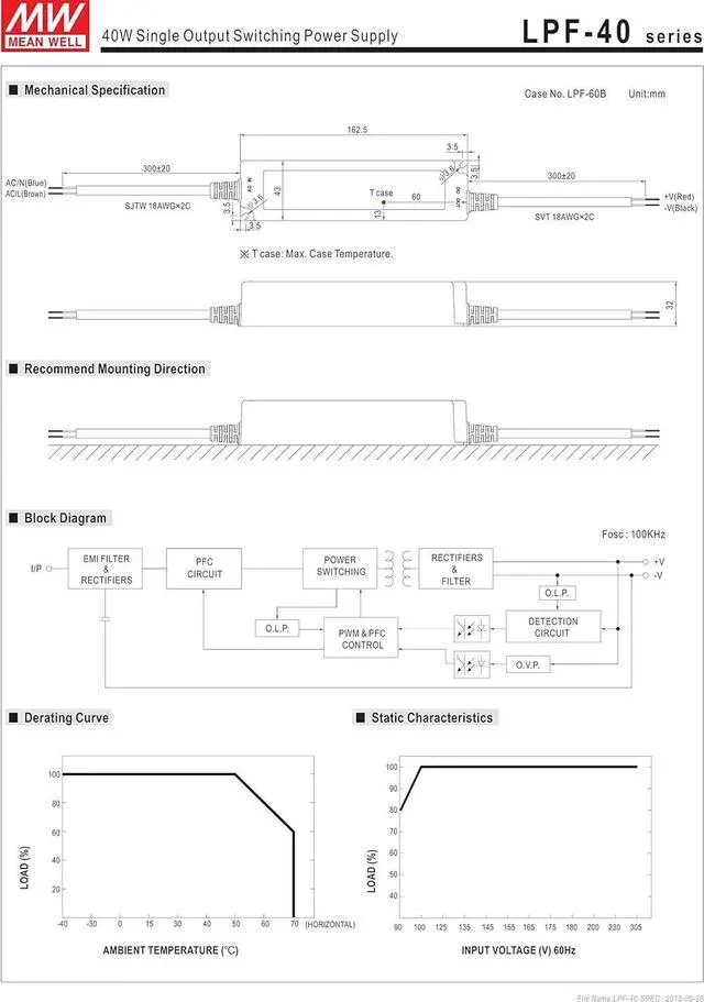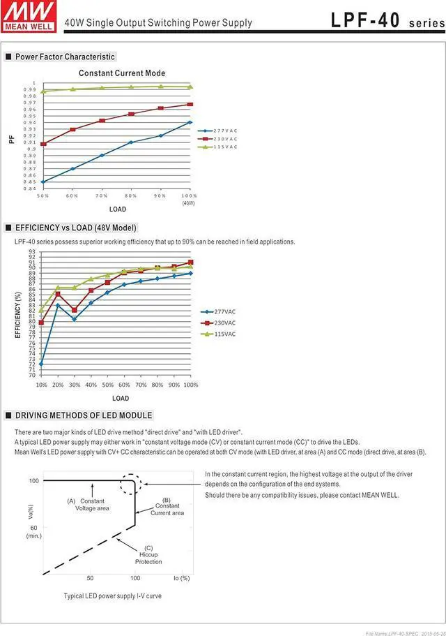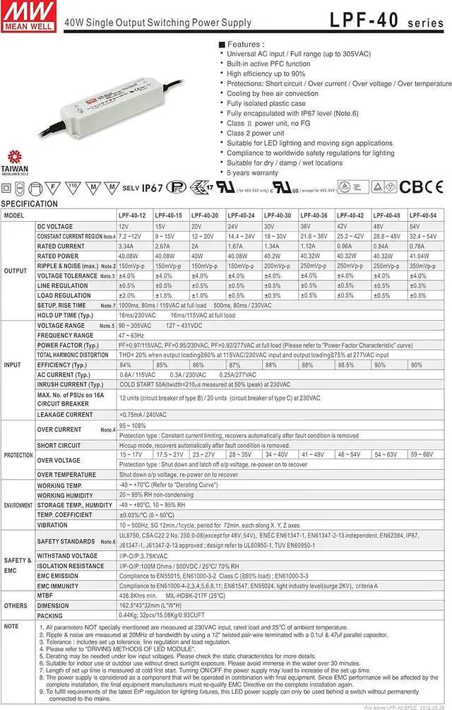 Universal AC input (up to 305VAC) / Full range Built-in active PFC function Suitable for dry, damp, and wet location Suitable for LED lighting and moving sign applications 5 years warranty