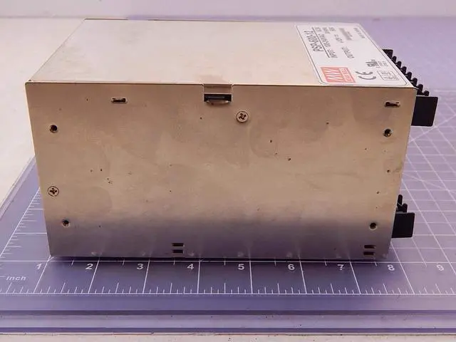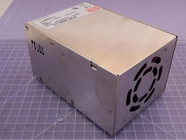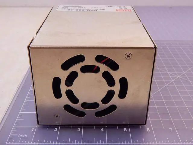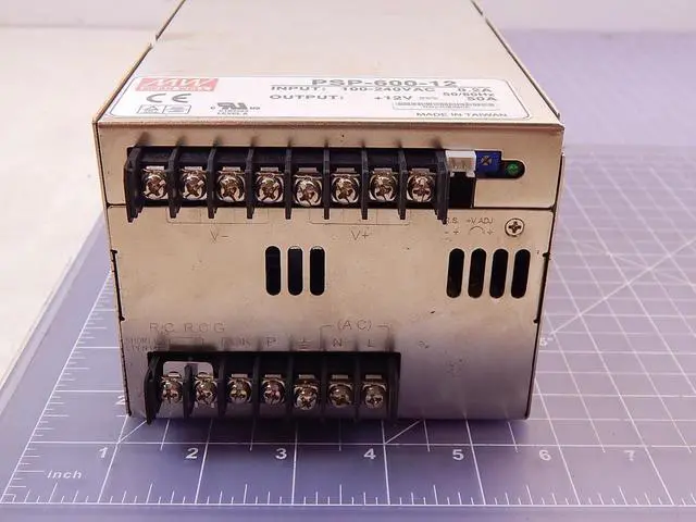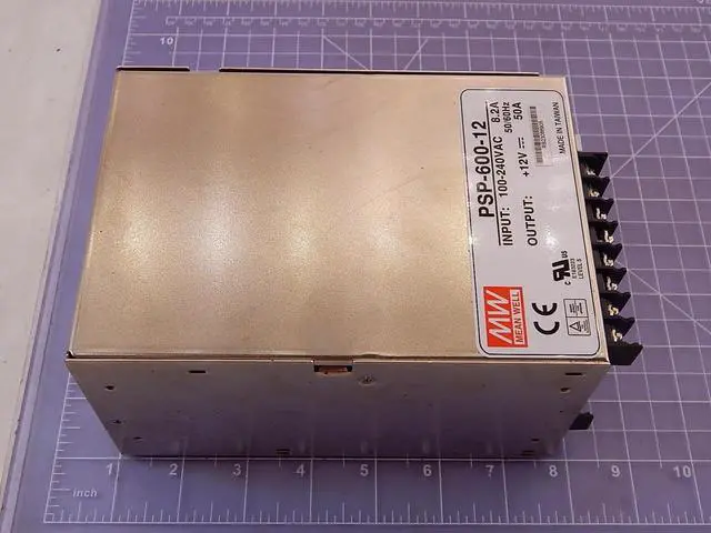 The product type is Mean Well PSP-600-12 Enclosed Switching AC-to-DC Power Supply, Single Output, 12V, 600W, 3.7" H x 4.7" W x 6.7" L. Made in China and manufactured by Mean Well.
