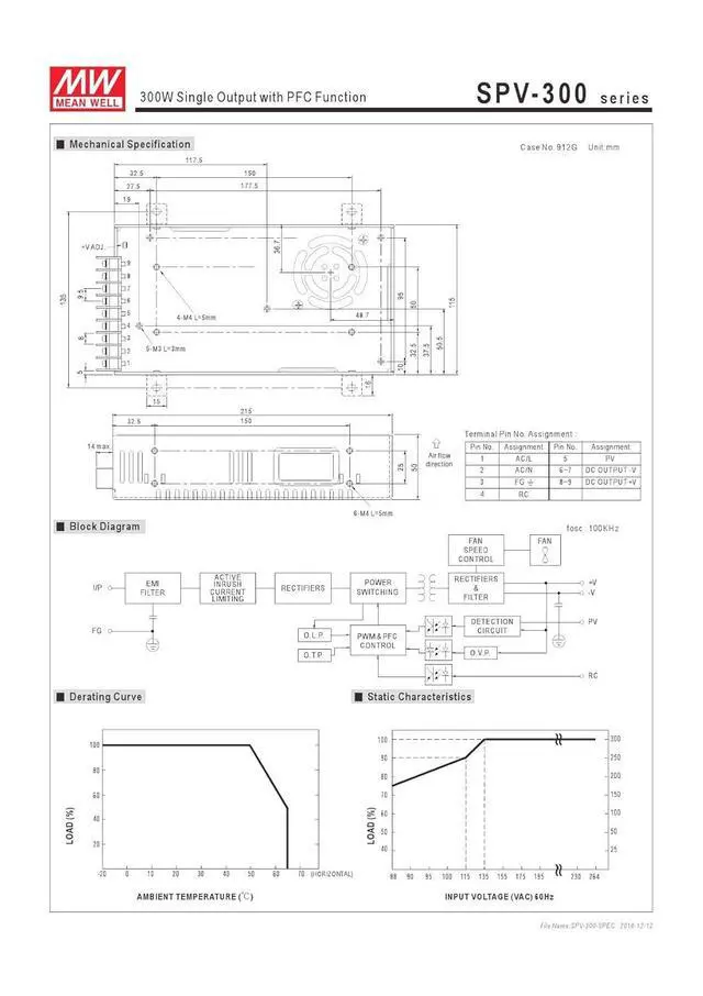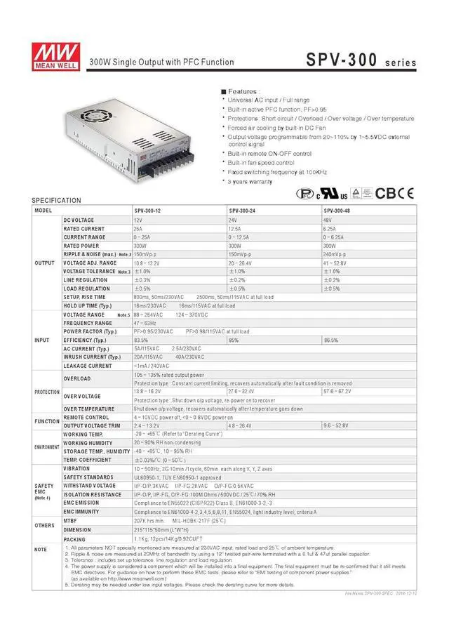 MEAN WELL SPV-300-24 AC-DC, Enclosed, Input: 100-240VAC / 50-60HZ / 5A, Output: 24VDC 12.5A, PFC & Parallel Series, Power Supply