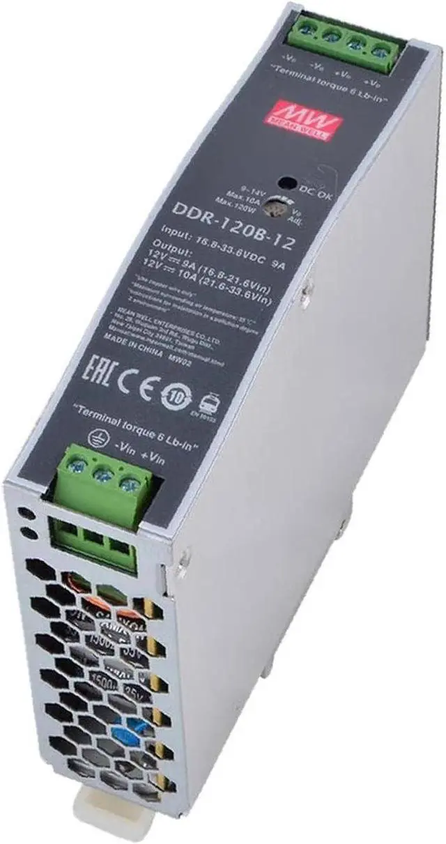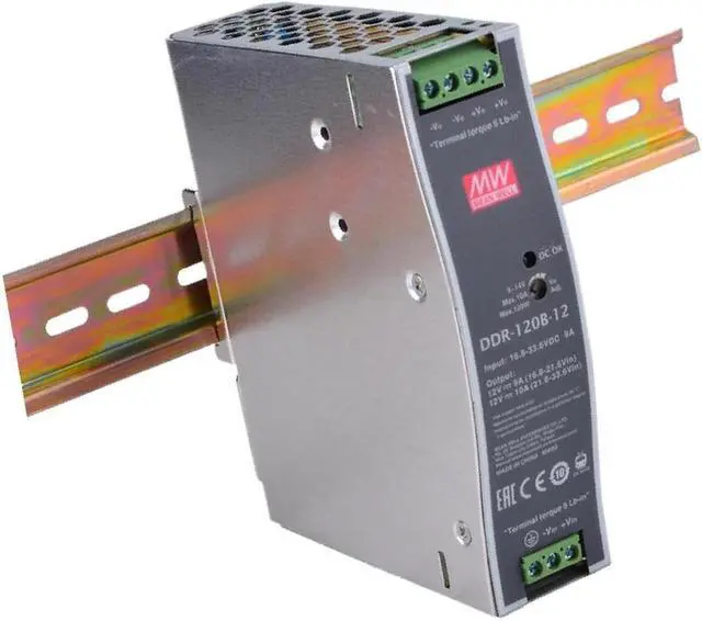 The DDR-120B-12 is a high-performance 120W converter designed for industrial and commercial applications. With a 12V DC output and 8.3A current capacity, the power converter can provide a stable 99.6W power with a conversion efficiency of up to 88.5%. It has a universal wide input voltage range of 9-18VAC and can automatically adapt to global voltage standards for international compatibility. The device adopts a compact metal case (32×125.2×102mm). The main technical indicators include: load regulation rate 1.0%, linear regulation rate 0.5%, and output voltage accuracy ±1%. In addition, it is equipped with a comprehensive protection system, including overload protection, overvoltage protection, short-circuit protection with automatic recovery function, and over-temperature protection.