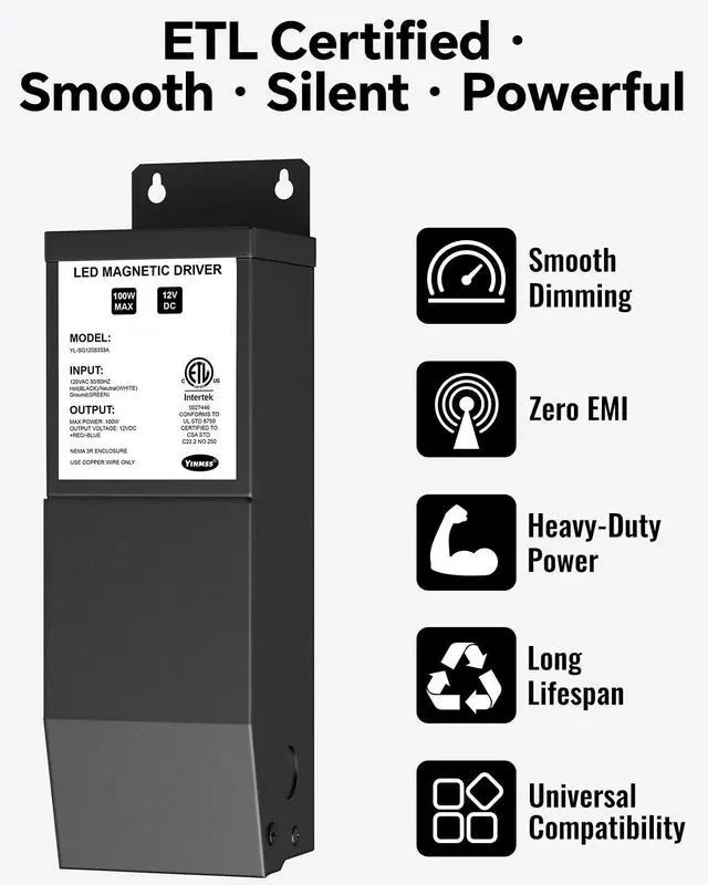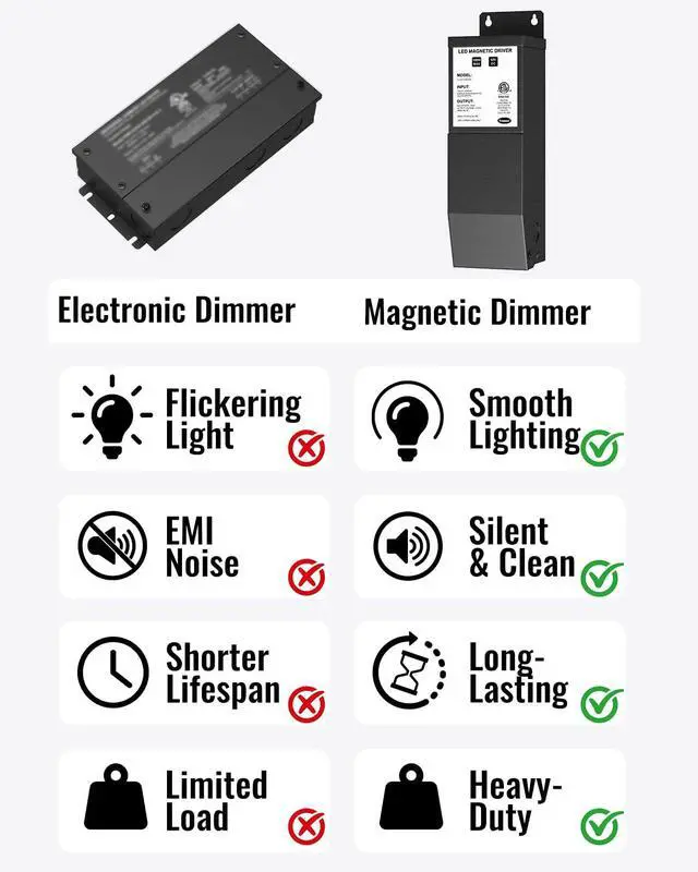 Quiet & EMI-Free Operation Advanced magnetic dimming technology minimizes electromagnetic interference (EMI), ensuring silent operation and clean, consistent power for reliable lighting performance.