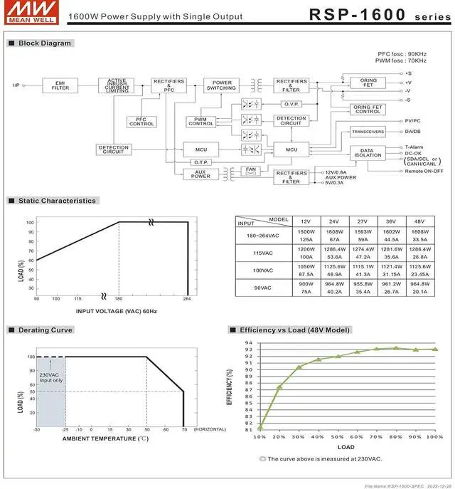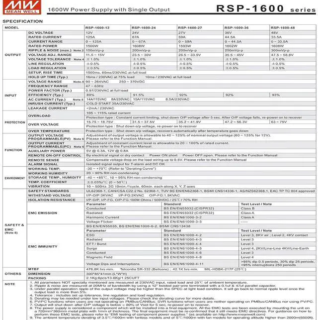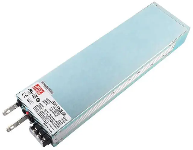 RSP-1600 is a 1.6KW single output enclosed type AC/DC power supply with a 1U low profile and a high power density up to 25W/inch3 .