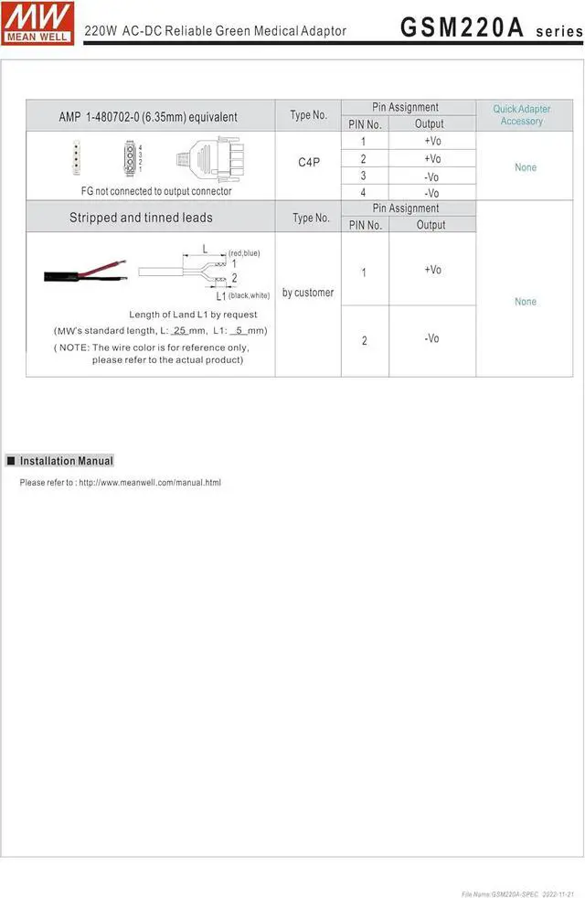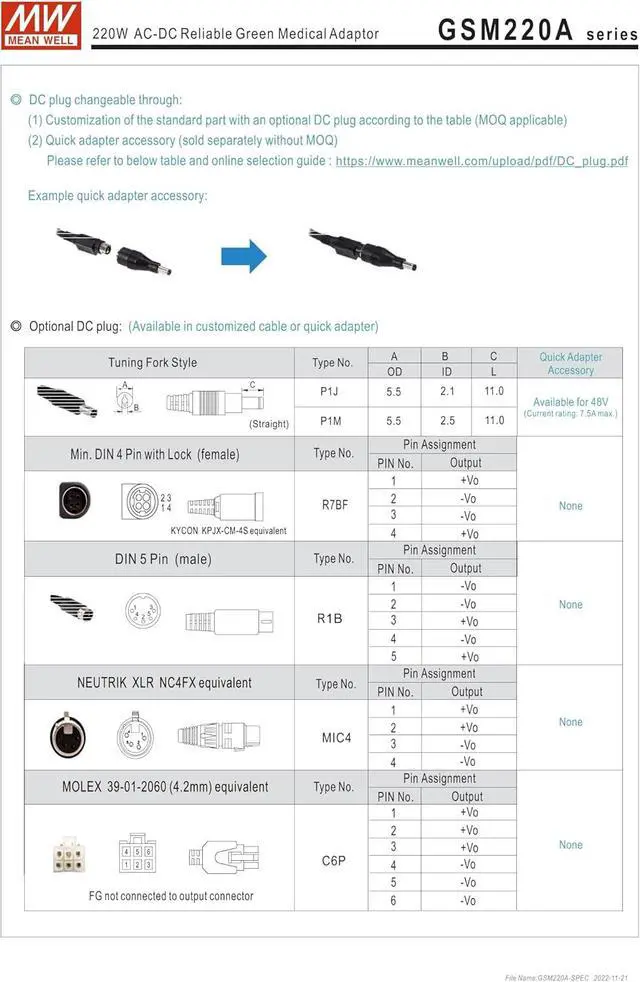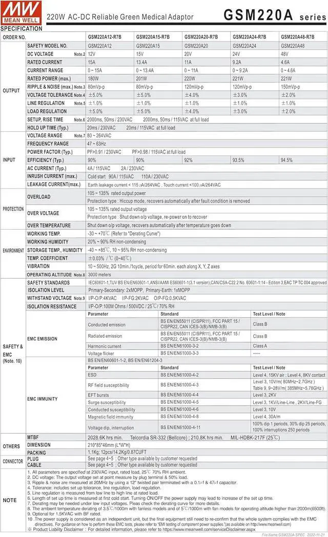GSM220A is a highly reliable, 220W desktop style single-output green medical adaptor series. This product is equipped with a 3-pin (with FG) standard IEC320-C14 power plug, adopting the input range from 80VAC to 264VAC. The entire series supplies different output voltages between 12VDC and 48VDC that can satisfy the demands for various kinds of medical electrical devices. The circuitry design meets the international medical standards (2*MOPP), having an ultra low leakage current (<1 00kA), fitting the medical devices in direct electrical contact with the patients. With the efficiency up to 94.5% and the extremely low no-load power consumption below 0.15W, GSM220A is compliant with USA EISA 2007/DoE, Canada NRCan, Australia and New Zealand MEPS, EU ErP ,and meet Code of Conduct (CoC) Version 5. The supreme feature allows the adaptor to save the energy when it is either under the operating mode or the standby mode. The entire series utilizes the 94V-0 flame retardant plastic case. GSM220A is approved with the international medical safety certificates.