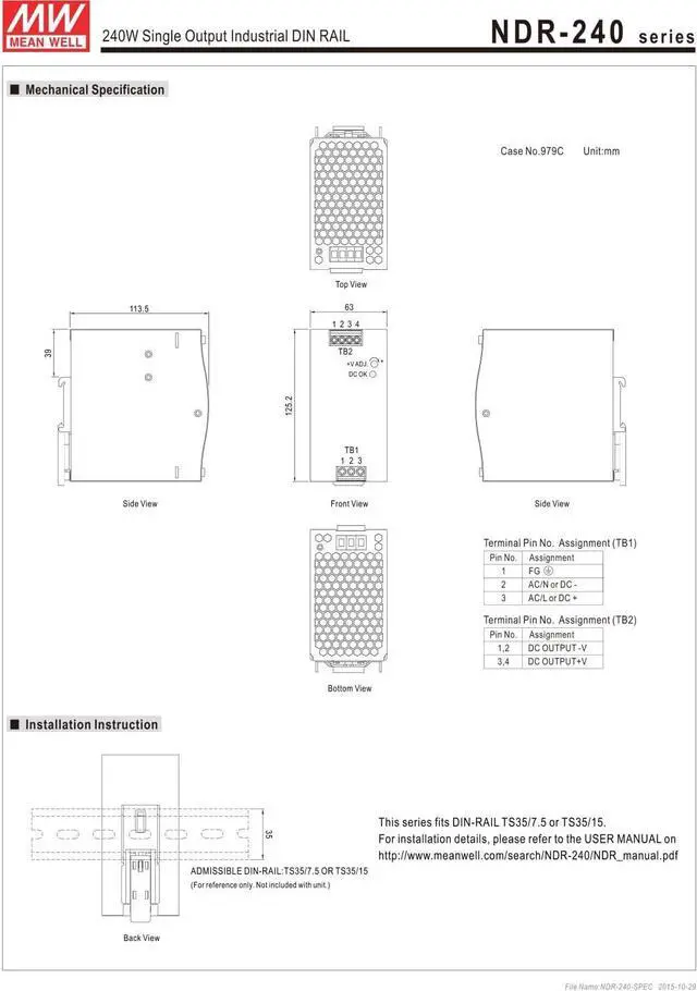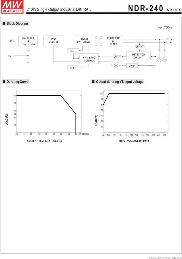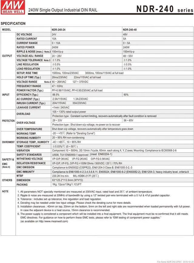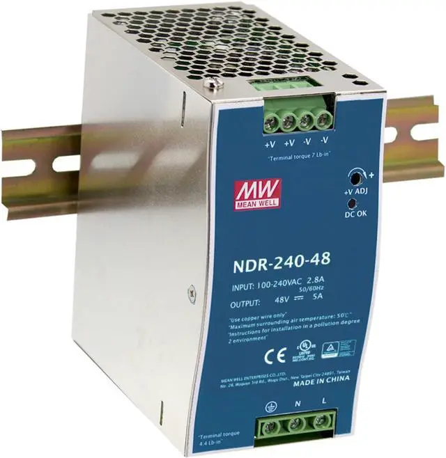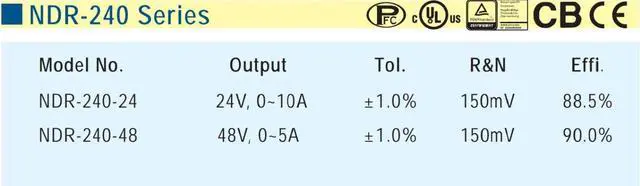 NDR-240 is one economical slim 240W Din rail power supply series, adapt to be installed on TS-35/7.5 or TS-35/15 mounting rails. The body is designed 63mm in width, which allows space saving inside the cabinets. The entire series adopts the full range AC input from 90VAC to 264VAC and conforms to EN61000-3-2, the norm the European Union regulates for harmonic current.