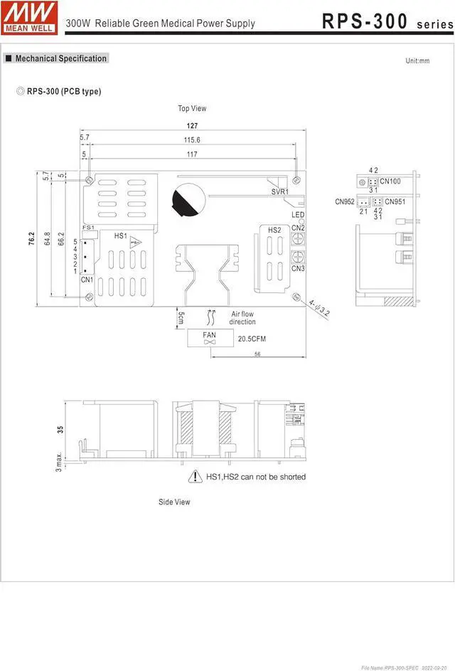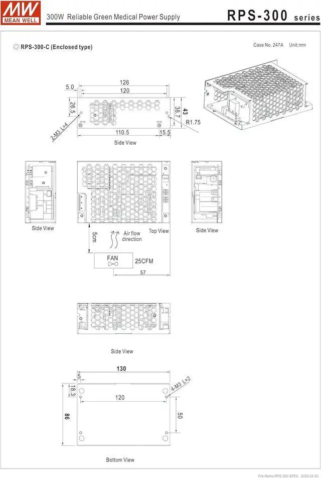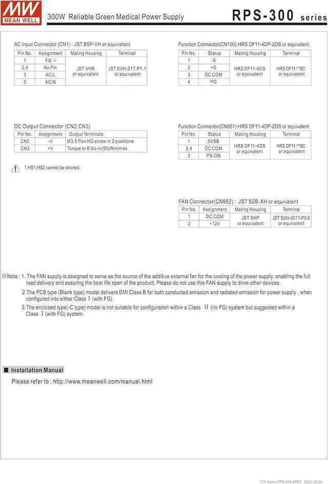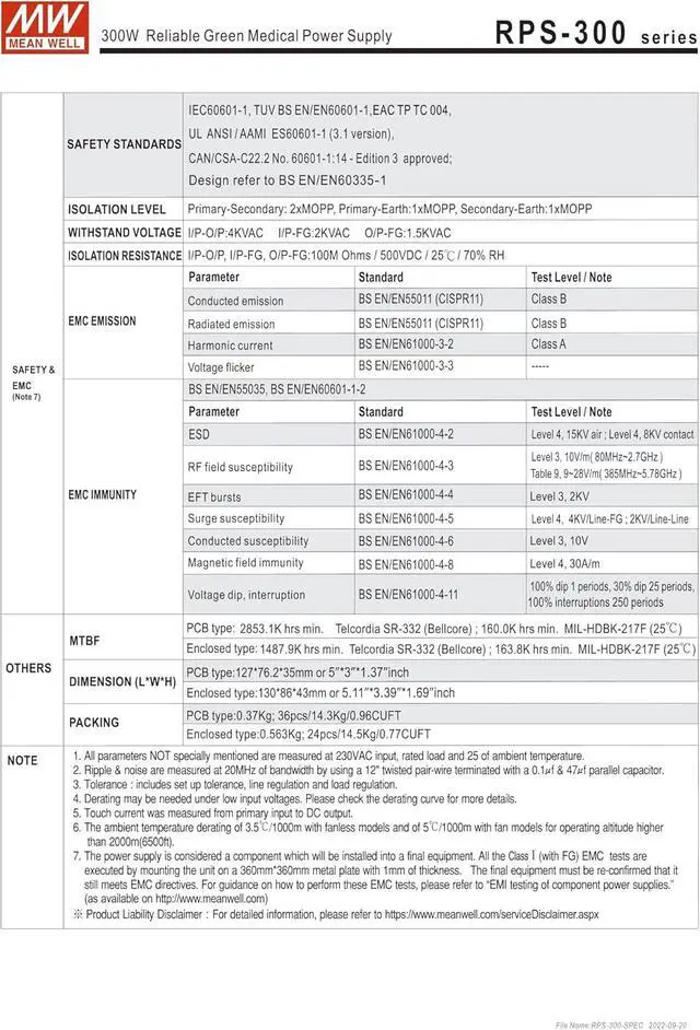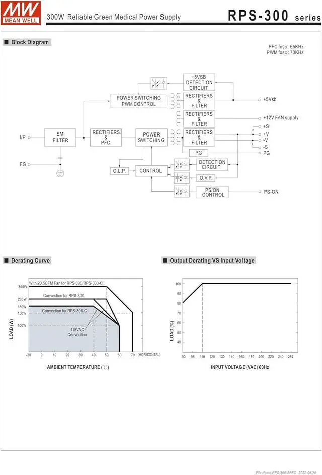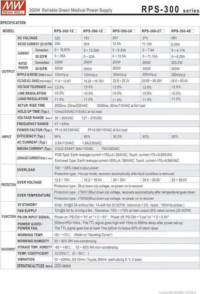 RPS-300 is a highly reliable green PCB type medical power supply with a high power density onthe 5" by 3" footprint. It accepts 90~264VAC input and offers various output voltages between 12V and 48v.The working efficiency is up to 93% and the extremely low no load power consumption is down below 0.5W.The extremely low leakage current is less than 150 4A. In addition, it conforms to international medicalregulations (2*MOPP) and EMC BS EN/EN55011, perfectly fitting all kinds of BF rated "patient contact"medical system equipment. RPS-300 series also offers the enclosed style model (RPS-300-C).