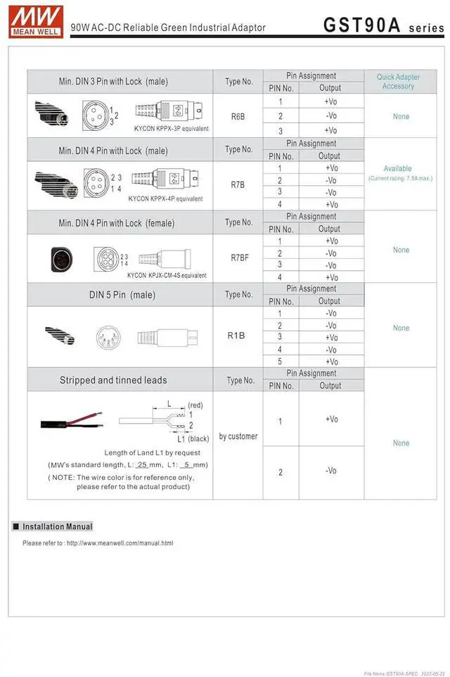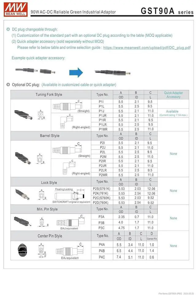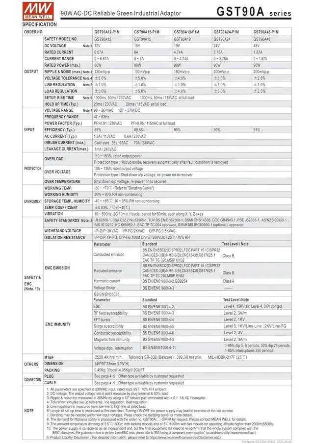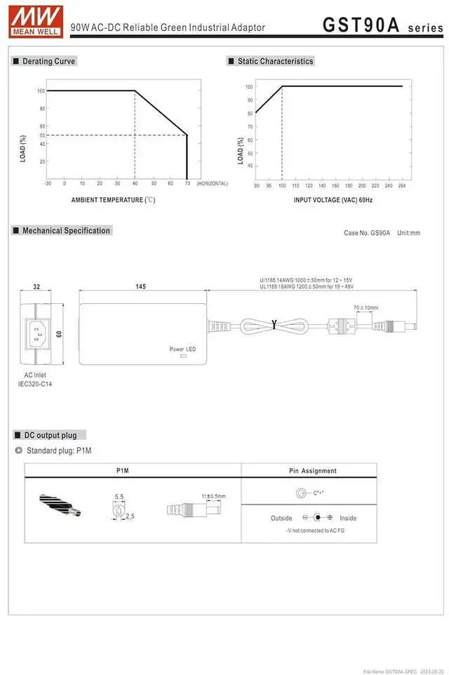 GST90A is a highly reliable, desktop style single-output green adaptor series. This product is a class Ipower unit(with FG), equipped with a standard lEC320-C14 AC inlet and adopting the input range from9oVAC to 264VAC. The entire series supplies different models with output voltages ranging between 12VDCand 48VDC that can satisfy the demands for various types of consumer electronic devices. With the efficiency up to 91% and the extremely low no-load power consumption below 0.15W,GST90A iscompliant with USAEISA 2007/DoE, Canada NRCan, Australia and New Zealand MEPS,Korea K-MEPS,EU ErP andCode of Conduct (CoC)Version 5. The supreme feature allows the adaptor to save the energy when it is either underthe operating mode or the standby mode. The entire series utilizes the 94V-O flame retardant plastic case. GST9oA is certified for the international safety regulations