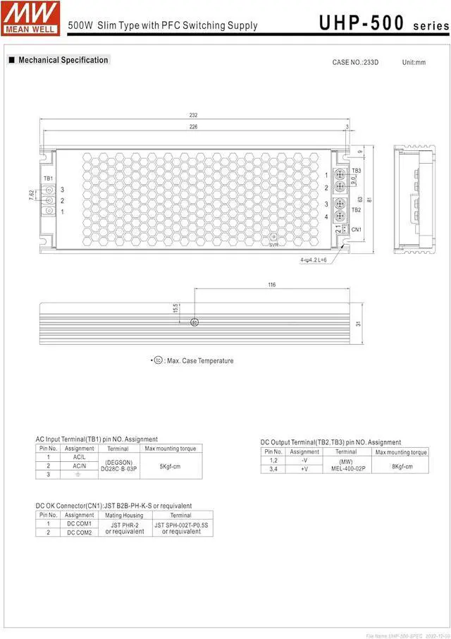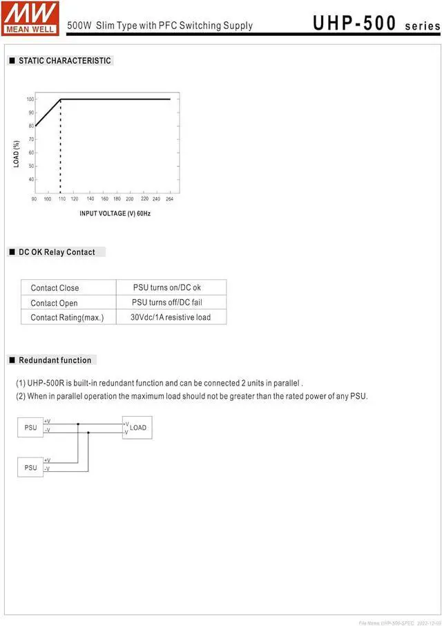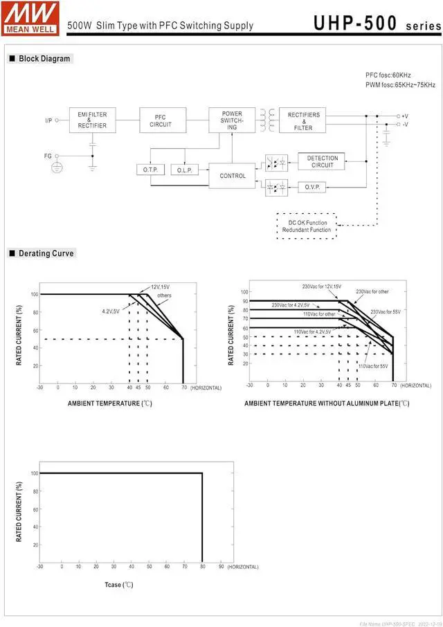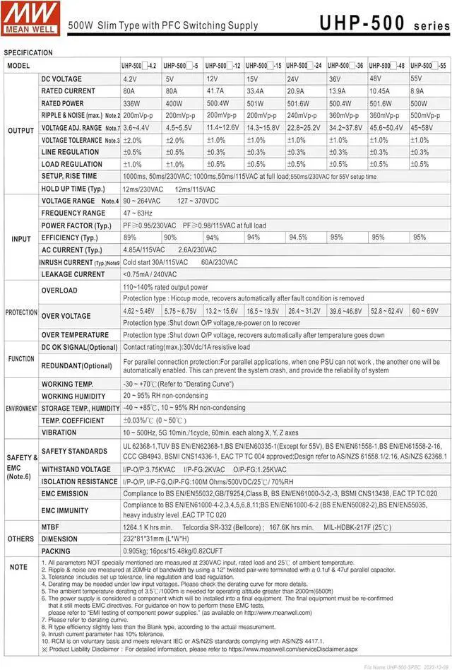 UHP-500 series is a 500W single-output slim type power supply with 31mm of low profile design.Adopting the full range 90~264VAC input, the entire series provides an output voltage line of 4.2v,5V,12V,15V,24V,36V,48Vand 55V.In addition to the high efficiency up to 95%, that the whole seriesoperates from -30 ~70 under air convection without fan. UHP-500 has the complete protectionfunctions and 5G anti-vibration capability;,lt is complied with the international safety regulationssuch as TUV BS EN/EN62368-1,BS EN/EN60335-1,UL 62368-1 and GB4943.UHP-500 seriesserves as a high performance power supply solution for various industrial applications.