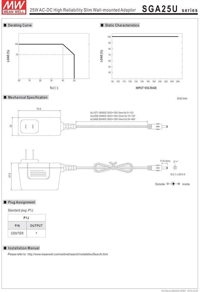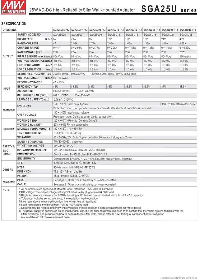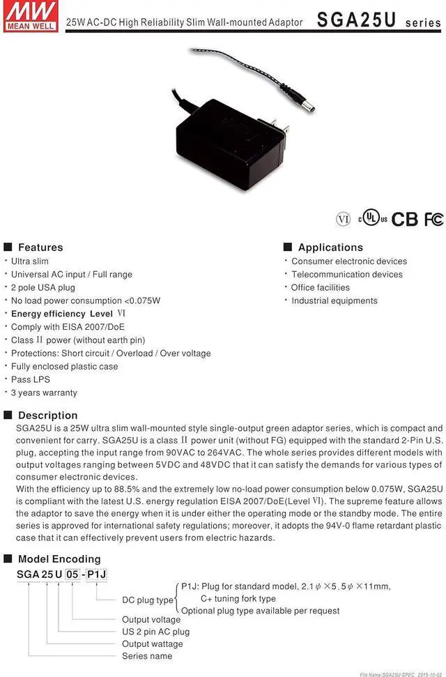 Mean Well SGA25U12-P1J Slim Wall-Mount Power Adapter, 12 Volt, 2.08 Amp, 25 Watt, 2.97" L x 1.26" W x 1.87" H, Black