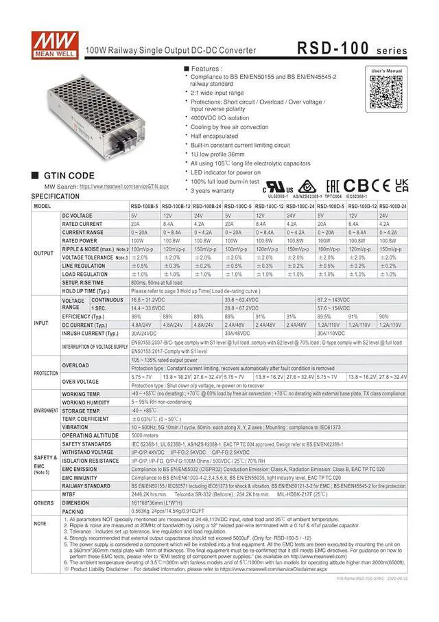 Mean Well RSD-100B-12 100.8W Railway Single Output DC-DC Converter RSD-100B 12V/8.4A