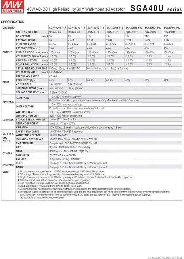 MEAN WELL SGA40U24-P1J 24V 1.67 Amp 40W Slim Wall-Mount Power Adapter