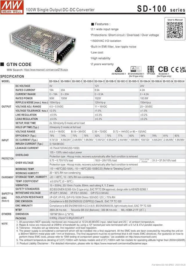 2:1 wide input range Protections: Short circuit / Overload / Over voltage 1500VAC I/O isolation Built-in EMl filter, low ripple noise Low cost High reliability
