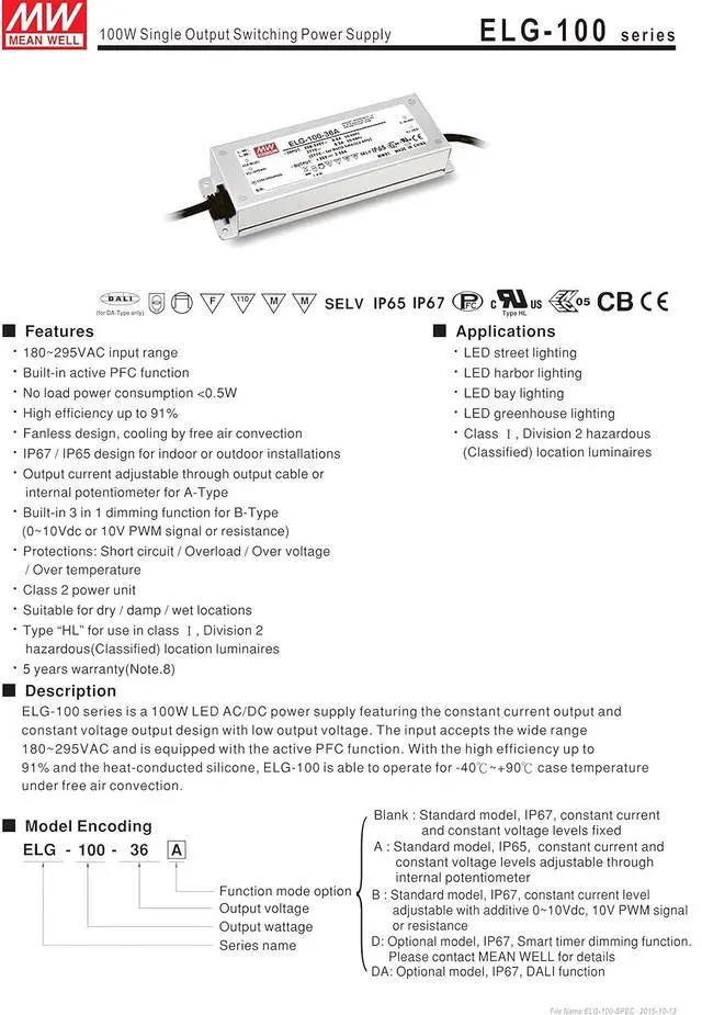 Constant voltage+constant current modes No load / Standby power consumption <0.5W Type HL LED Driver for use in Class I, Division 2 hazardous location luminaires Suitable for dry / damp / wet locations 5 years warranty