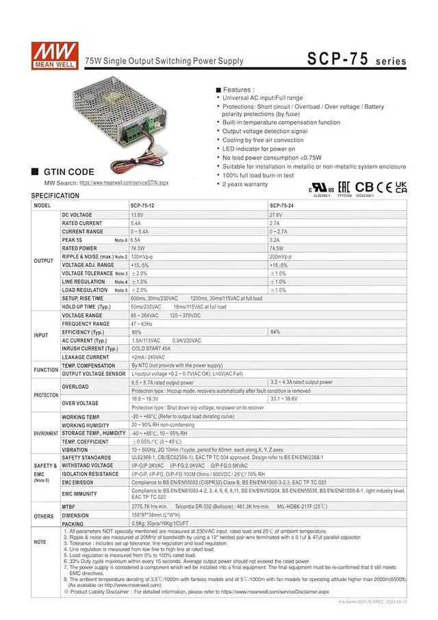 Mean Well SCP-75-12 74.5W Single Output Switching Power Supply SCP-75 13.8V 5.4A