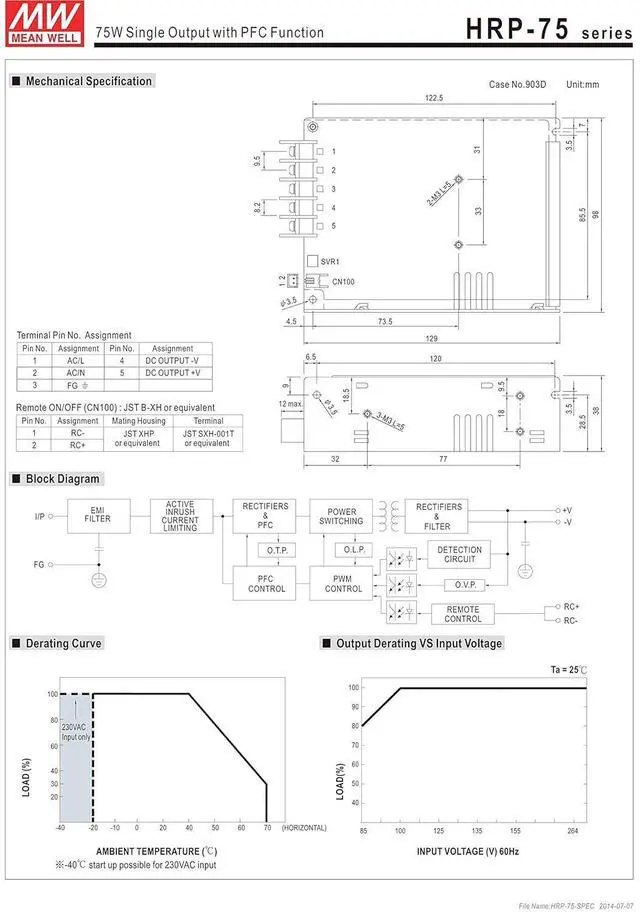 Primary Output Voltage (VDC): 5 Output Current (Amps): 15 Maximum Output Power (Watts): 75 Input Voltage (VAC): 85 to 264 Input Frequency (Hz): 47 to 63
