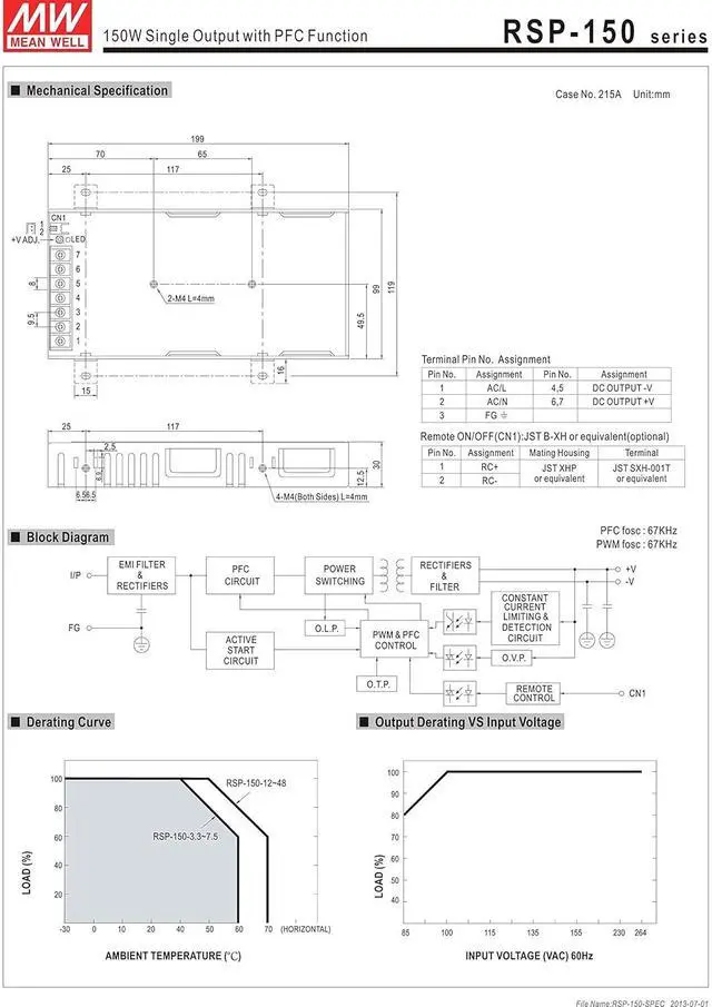 Primary Output Voltage (VDC): 27 Output Current (Amps): 5. 6 Maximum Output Power (Watts): 150 Input Voltage (VAC): 85 to 264 Input Frequency (Hz): 47 to 63