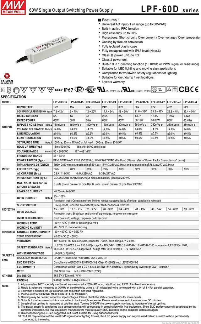 Universal AC input (up to 305VAC) / Full range Built-in active PFC function Suitable for dry, damp, and wet location Suitable for LED lighting and moving sign applications 5 years warranty