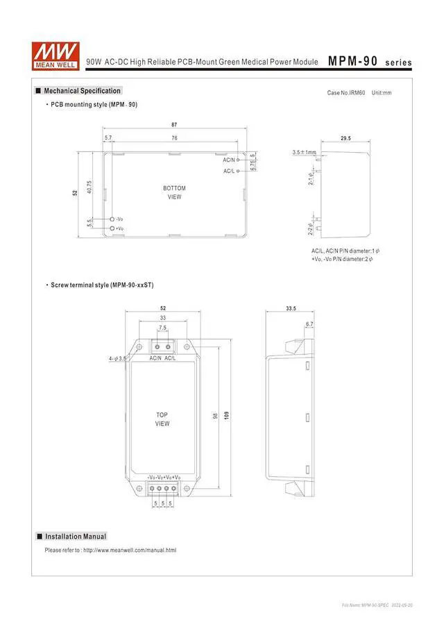 Medical safety approved (2 x MOPP) according to ANSI/AAMI ES60601-1 and lEC/BS EN/EN60601-1
