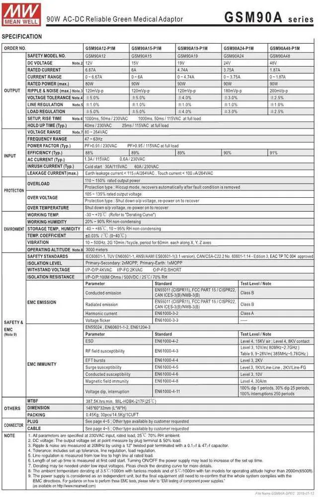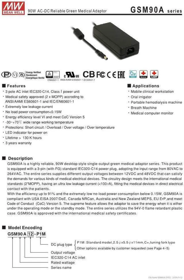 Medical safety approved (2xMOPP) Suitable for BF application with appropriate system consideration (B-Type only) Energy efficiency Level VI Protections: Short circuit / Overload / Over voltage / Over temp 3 years warranty