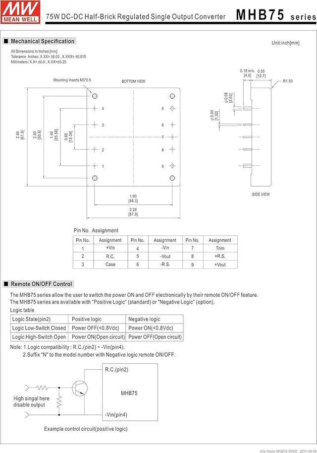 Half-brick size (2.28"x 2.4"x 0.5") with industry standard pin out Dual in line package 2:1 wide input range Protections: Short circuit / Over current / Over voltage / Over temperature 3 years warranty