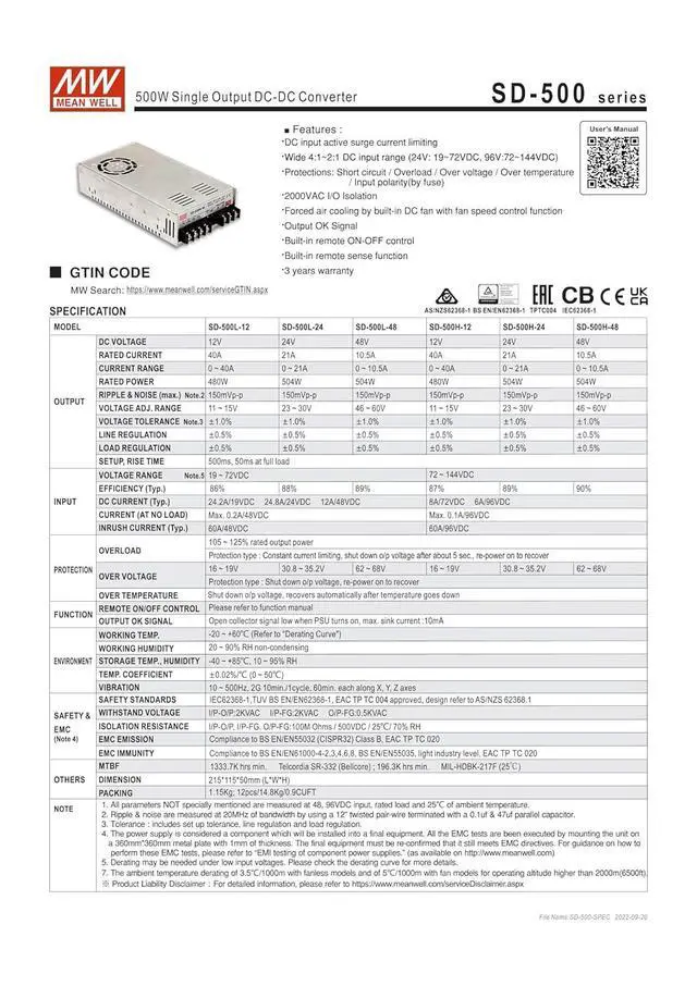 Protections: Short circuit / Overload / Over voltage / Over temperature / Input polarity(by fuse)
