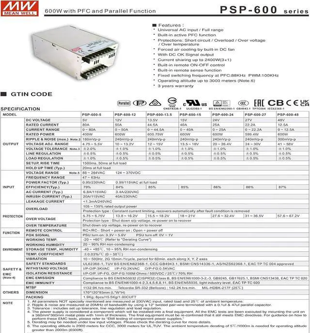 Mean Well 600W with PFC and Parallel Function Unit Power Pack 48v Convert A Bench Gaming Lab Top Lab Top Computer 13.5V 44.5A (PSP-600-13.5 13.5V/44A/PFC and Parallel)