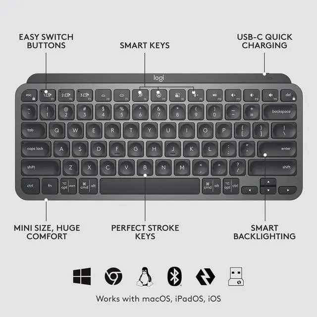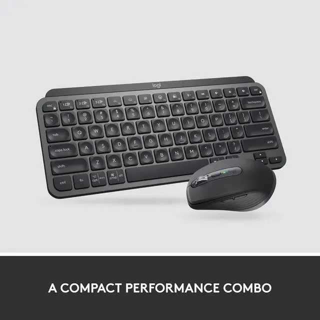 A compact and stylish design that clears space on any work surface, MX Keys Mini Combo For Business makes it easier for creators to create and work comfortably. Its the ultimate, compact performance combo ideal for coders, analysts and creative workers. MX Keys Mini Keyboard and MX Anywhere 3 Mouse are perfect for those who need a bit more room and better portability for work station hopping and travel. Its all about precision, performance and security with this duo. The keyboards Perfect Stroke keys are shaped to your fingertips with backlighting that automatically adjusts. The mouses Darkfield Technology allows precise, smooth tracking, even on glass. For users who need extra precision, the MagSpeed scroll wheel runs through 1,000 lines in a second or can scroll with pixel-by-pixel accuracy. The minimalist design benefits from improved ergonomics to align shoulders better, allowing closer mouse placement for less reaching, more comfort, and better body posture. Connect to up to three computers with the Easy-Switch button and swap among them effortlessly. MX Keys Mini Combo features Logi Bolt wireless technology, engineered to conquer modern IT security challenges. Delivering reliable connections even in congested wireless environments. The pair is fully encrypted and FIPS secure when paired with a Logi Bolt USB receiver. Easy for IT Help Desks to deploy and manage, the combo is compatible with all major platforms. Both mouse and keyboard are rechargeable with Li-Po batteries (keyboard 1500 mAh, mouse 500 mAh) and can be used while charging (USB-C charge port).