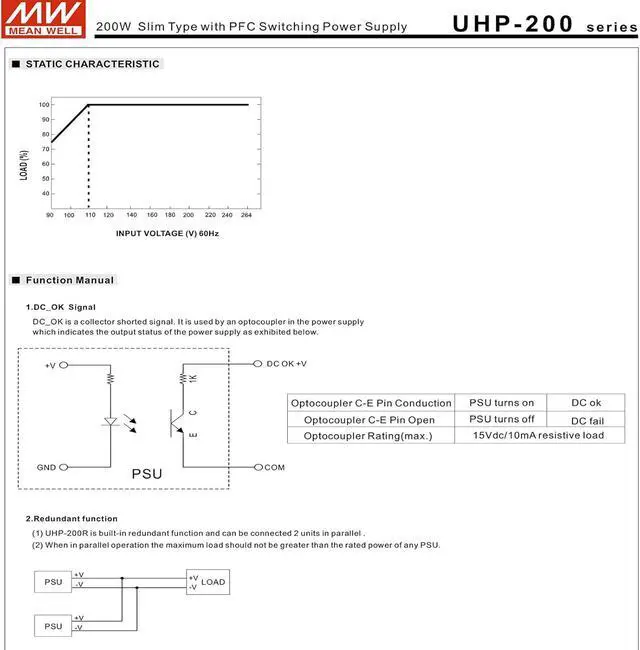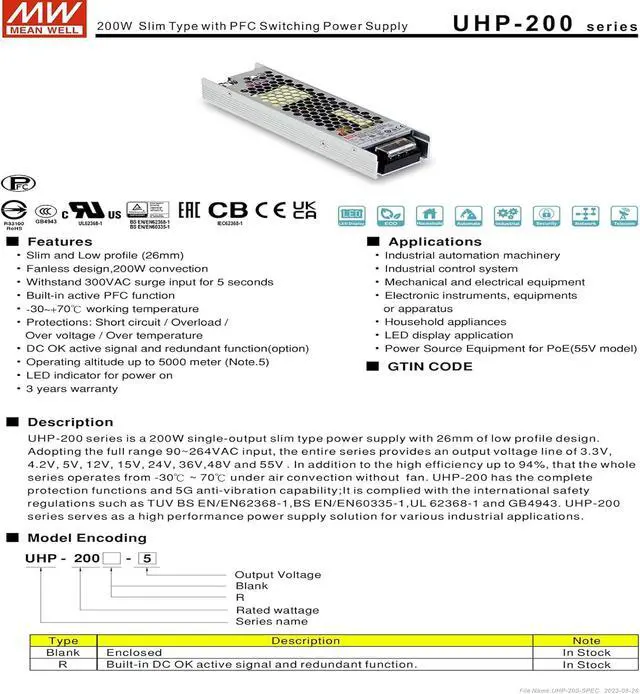 Slim and Low profile (26mm) Fanless design,200W convection Withstand 300VAC surge input for 5 seconds Built-in active PFC function -30~+70 working temperature