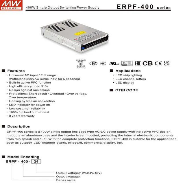 Universal AC input / Full range (Withstand 300VAC surge input for 5 seconds) Built-in active PFC function High efficiency up to 91% Design against rain splash Cooling by free air convection