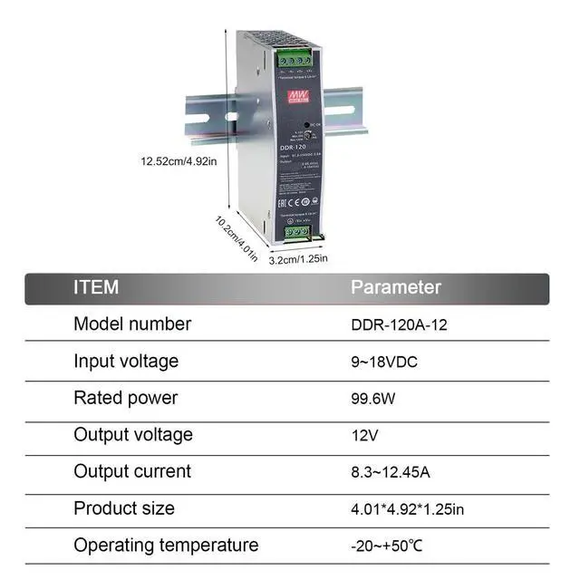 Safety and Protection: Safety is paramount, and the DDR-120A-12 incorporates multiple protection features. These include protection against overloads, over-voltage, reverse polarity, and short circuits, ensuring the longevity of the converter and the safety of your connected equipment.