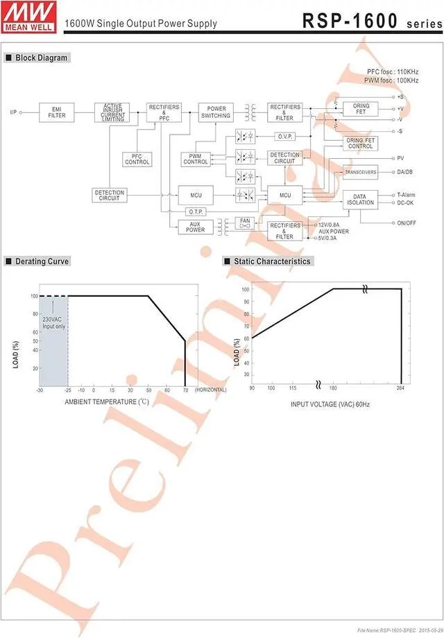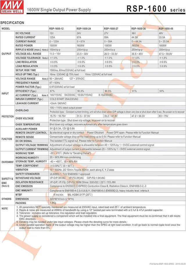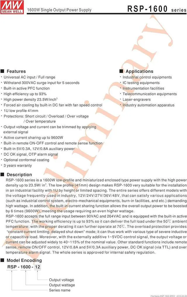 Mean Well Original RSP-1600-27 Single Output with PFC Function Power Supply 27V 59A 1593W