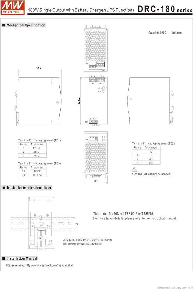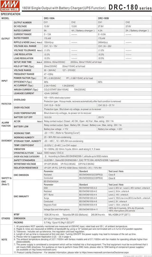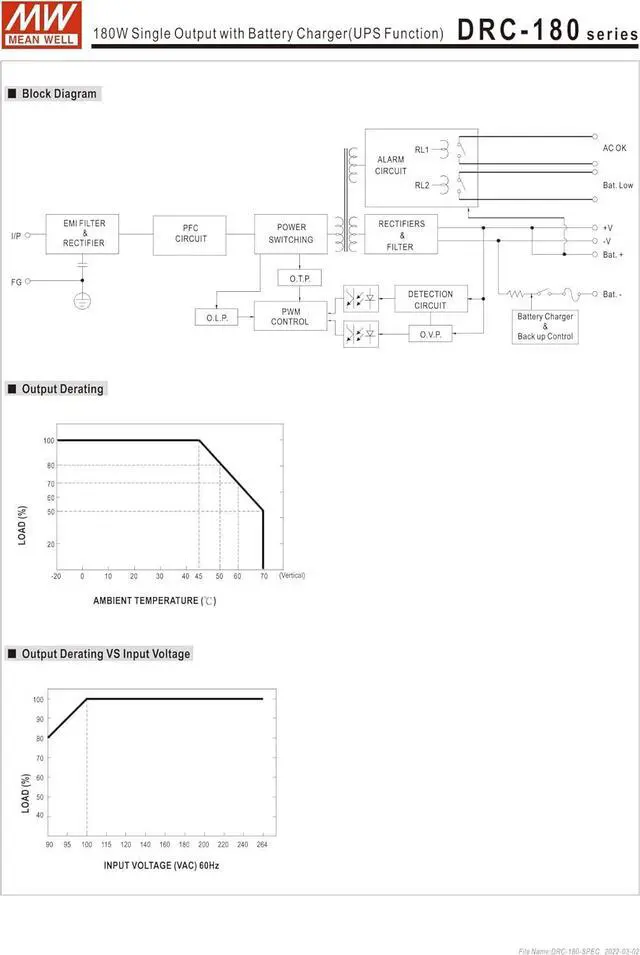 Mean Well DRC-180A 179.4W Single Output with Battery Charger(UPS Function) DRC-180