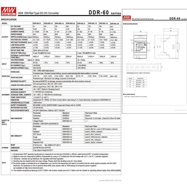 Stable 24V Constant Current Output: The DDR-60G-24 provides a consistent and dependable 24V DC output with a constant current of 2.5A, ensuring optimal performance of connected equipment.