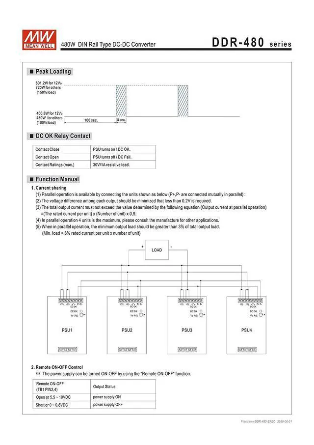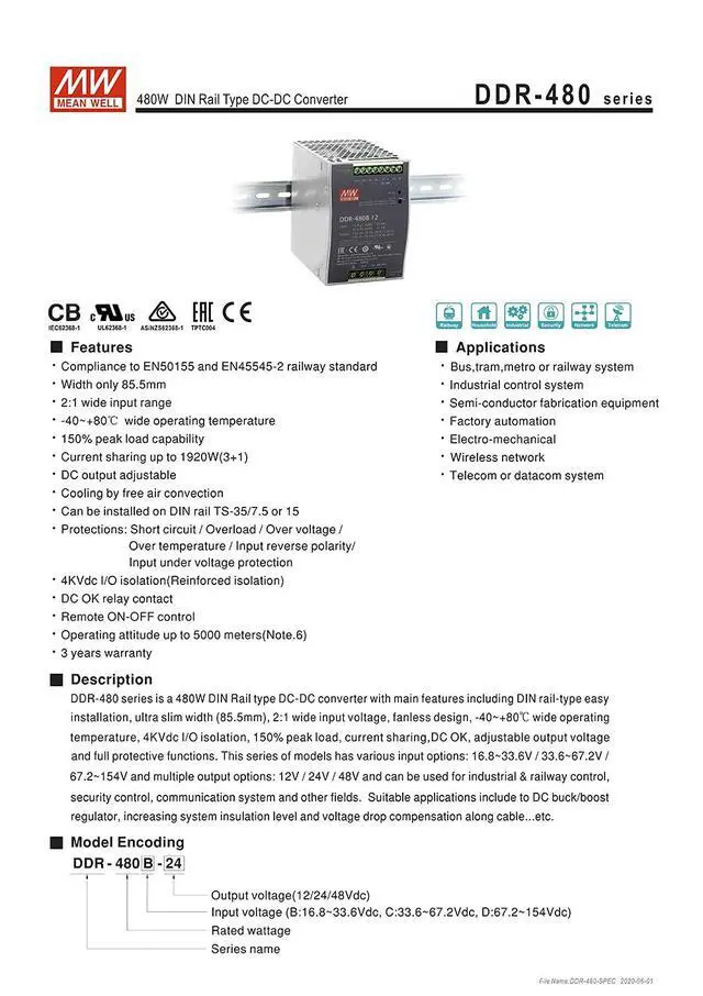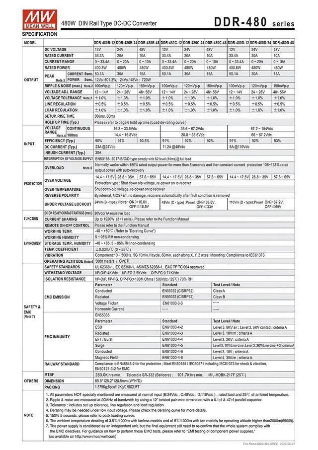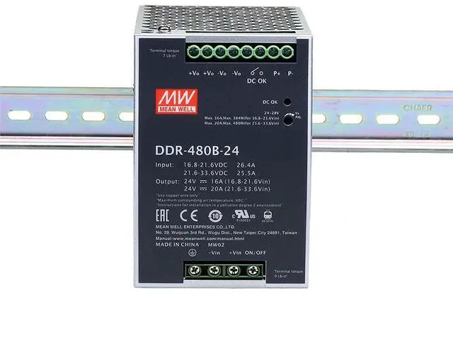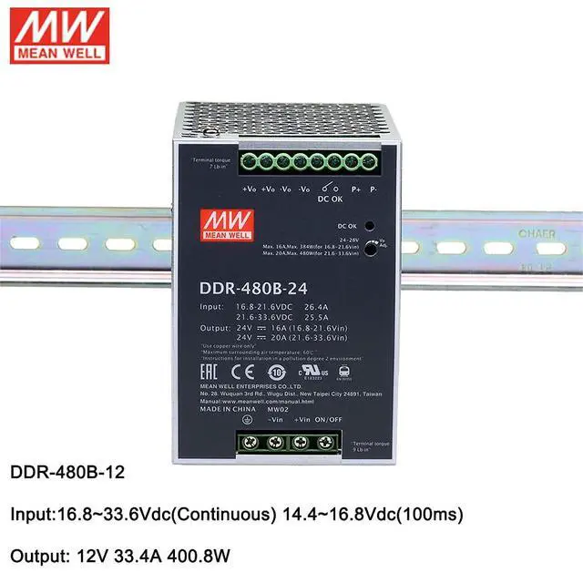 Model DDR-480B-12 Input Range: 16.8-33.6Vdc, Output: 12Vdc 33.4A 400.8W