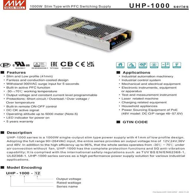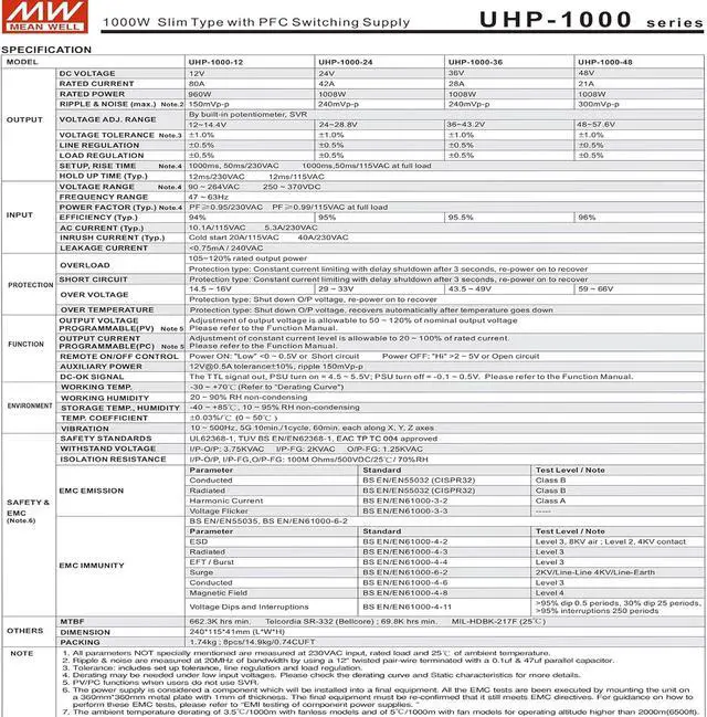 Mean Well 1000W Slim Type with PFC Switching Supply Gaming Pc Power Supply 1000w Convert A Bench Computer Power Supplies (UHP-1000-36 36V/28A/1008W/PFC Switching)