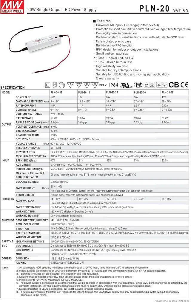 [PowerNex] Mean Well LPF-20-36 36V 0.55A 19.8W Single Output LED Switching Power Supply with PFC