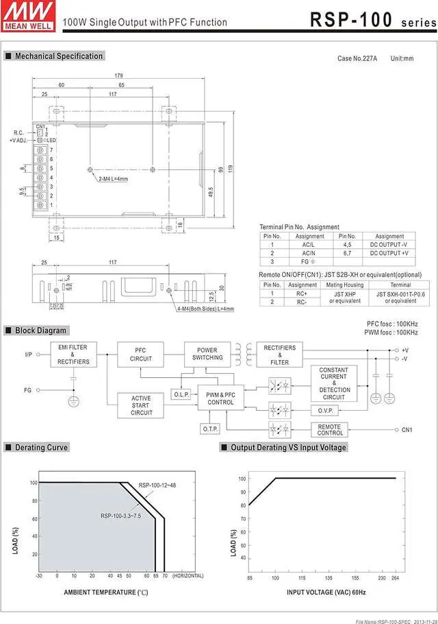 Universal AC input / Full range Built-in active PFC function Cooling by free air convection Built-in constant current limiting circuit (RSP-75/100/150) 3 years warranty