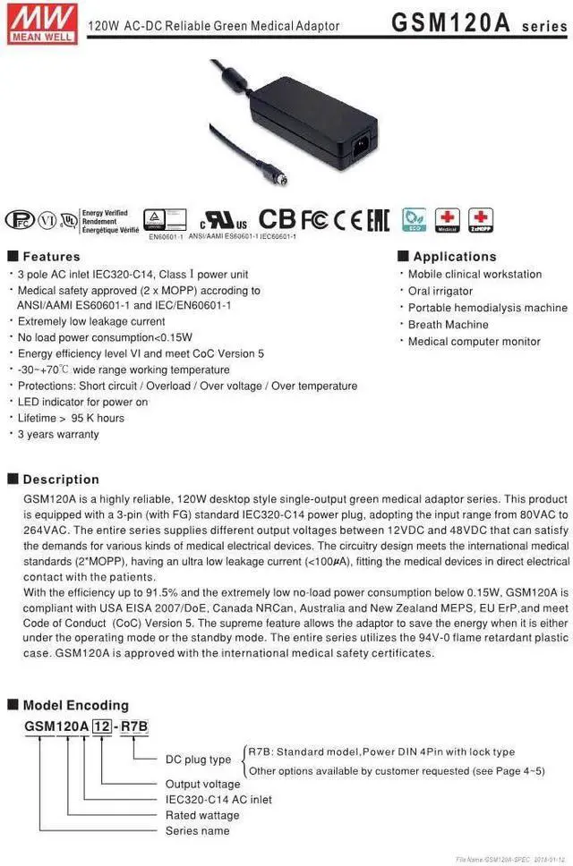 Medical safety approved (2xMOPP) Suitable for BF application with appropriate system consideration (B-Type only) Energy efficiency Level VI Protections: Short circuit / Overload / Over voltage / Over temp 3 years warranty