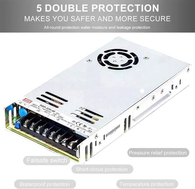 The RSP-320-48 achieves up to 90% efficiency, minimizing energy waste and operating costs. The integrated DC fan provides efficient cooling, allowing for operation in high-temperature environments up to 70°C.