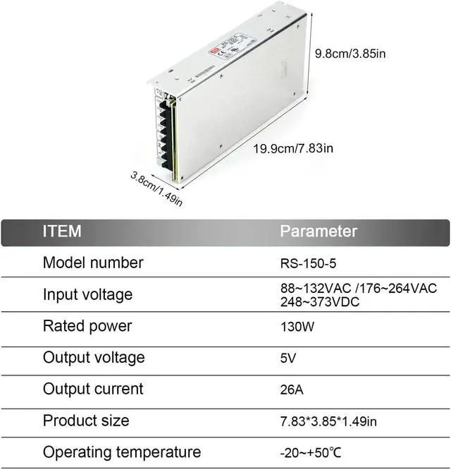 Comprehensive Protection Features: The RS-150-5 features built-in protection against short circuits, overload, and over-voltage, safeguarding your valuable equipment. The hiccup mode overload protection automatically recovers once the fault condition is removed.