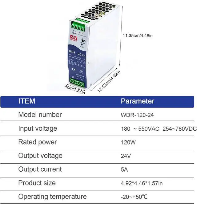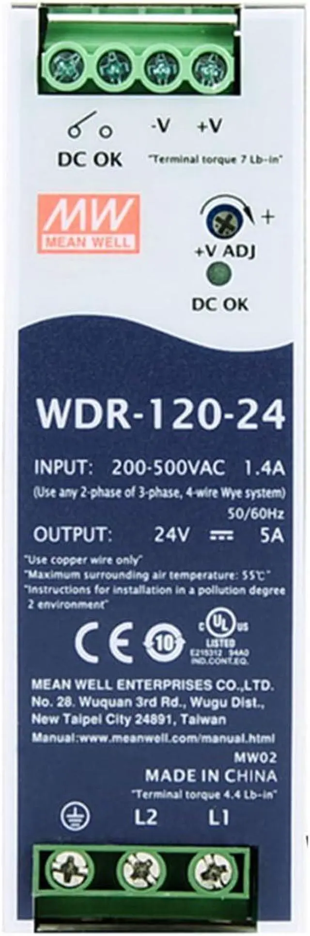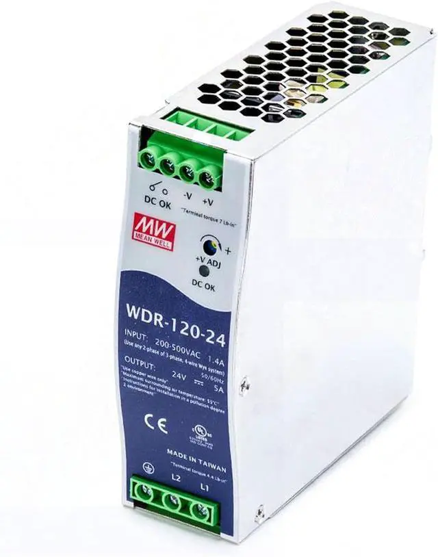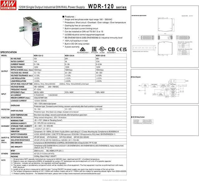 Globally Certified for Industrial Use: The WDR-120-24 120W (24V, 5A) power supply meets stringent global standards (UL, CB, CE), ensuring reliable operation in demanding industrial environments.