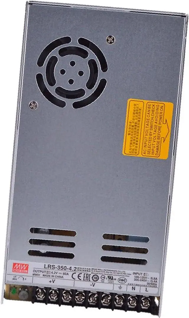 The TorqCali LRS-350-4.2 is a 350W single output enclosed power supply that delivers a reliable 4.2V DC output at 60A. Designed with a compact 30mm low profile and utilizing a 115-230VAC universal input, this power supply is ideal for a variety of applications where space is limited. This unit features high efficiency, reaching up to 81%, reducing energy consumption and heat generation.