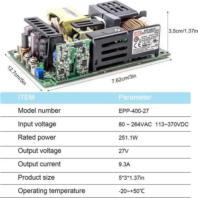 Compact and Reliable: 5"x3" size, delivers 27V 14.9A 400W power with universal full range AC input and active PFC, up to 93.5% efficiency