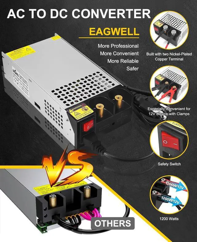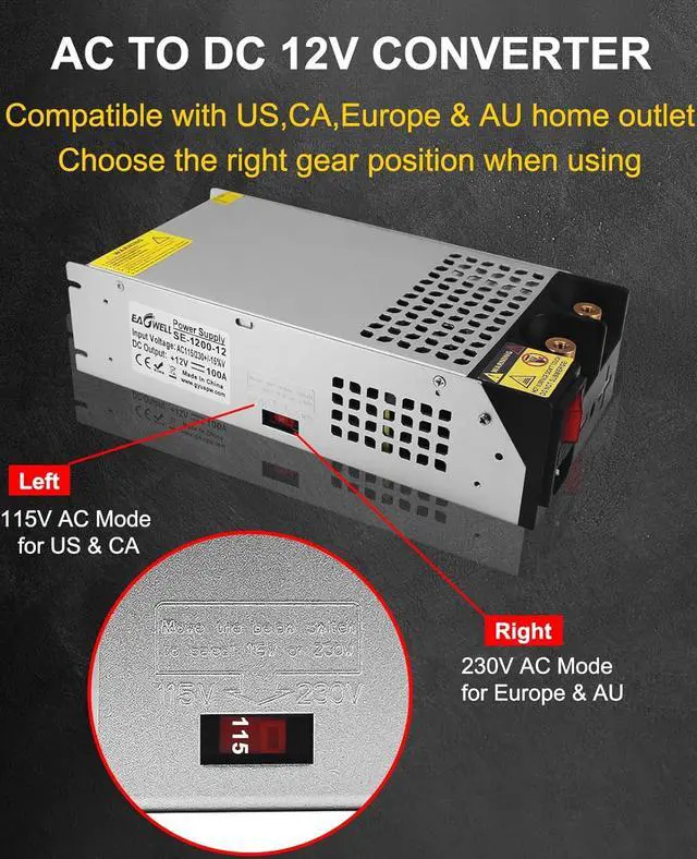 Dual Input Voltage: Eagwell converter supports AC input voltage of 110V-120V or 220V-240V. The SMPS Model automatically adjusts to the wide voltage input range (12V 1A-5A, 12W-60W). The output current depends on the device being used, such as 10A 120W, 20A 240W, 50A 600W, with a maximum current of up to 100A and power of 1200W